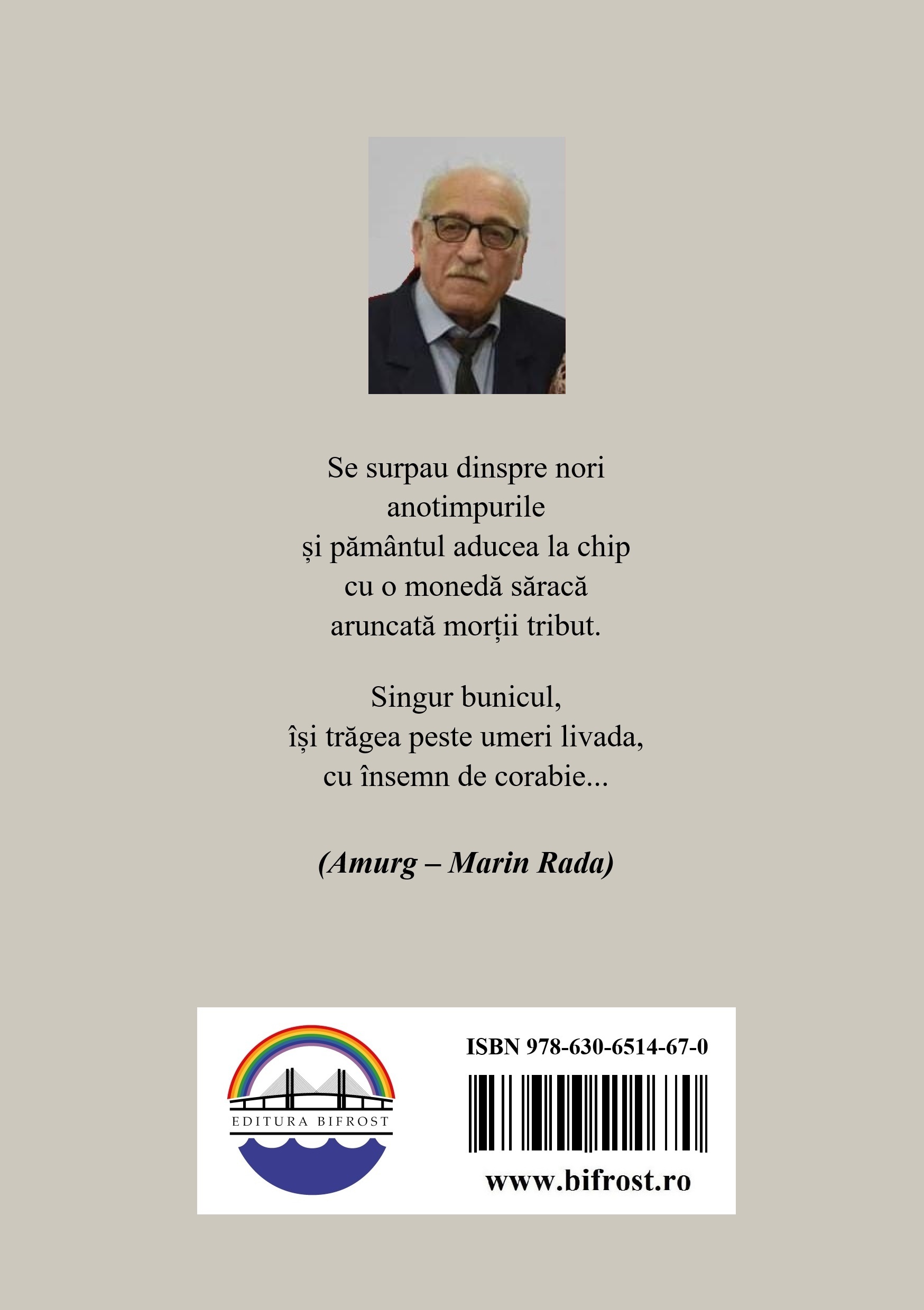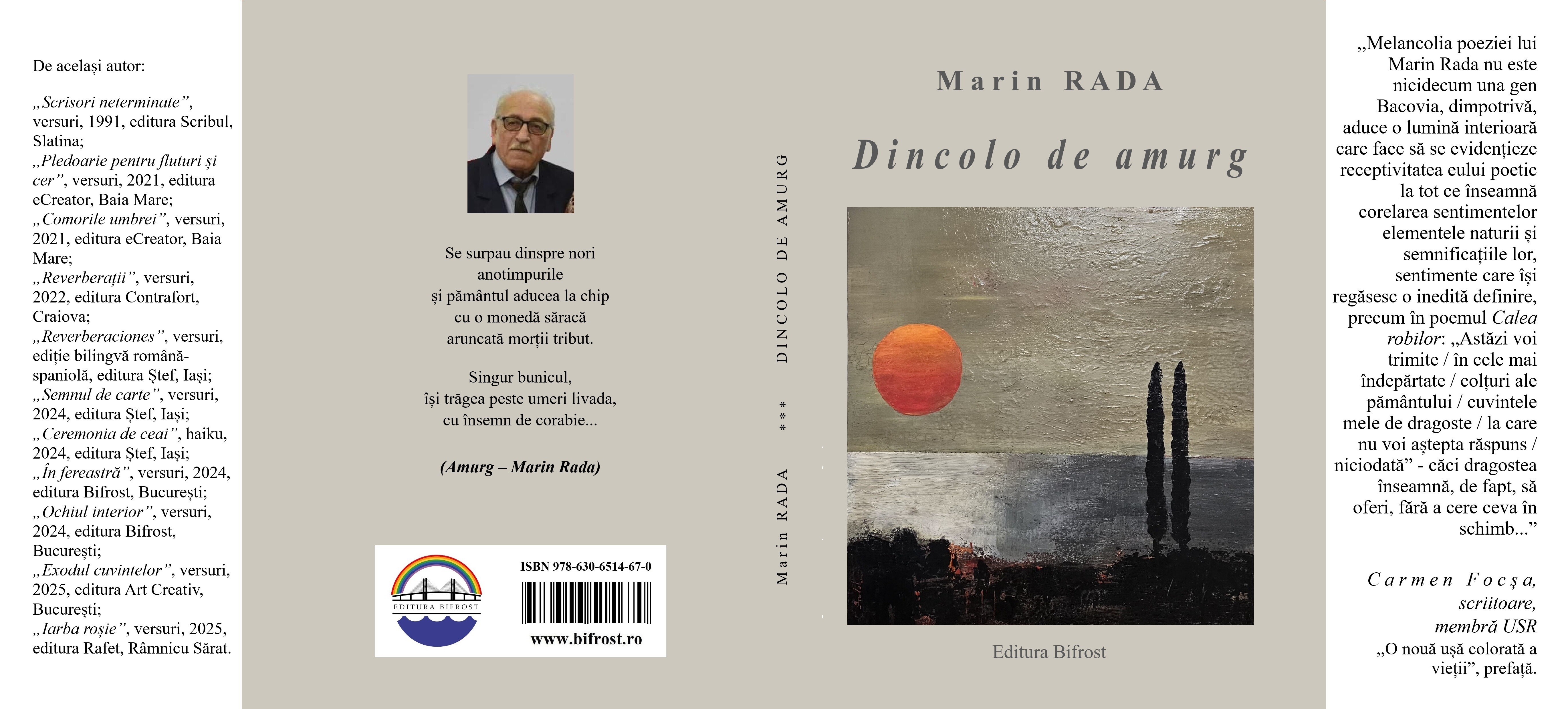 „Poetul Marin Rada oferă cititorilor un nou volum de poezie al cărui titlu - DINCOLO DE AMURG - este mai mult decât sugestiv, sprijinind ideea transcenderii timpului prin puterea artei… Amurgul creației dumisale e încă departe, deocamdată poezia reflectând o vârstă a cugetărilor profunde, a analizei sublime a trăirilor, a rememorărilor sub semnul metaforei.” - CARMEN FOCȘA