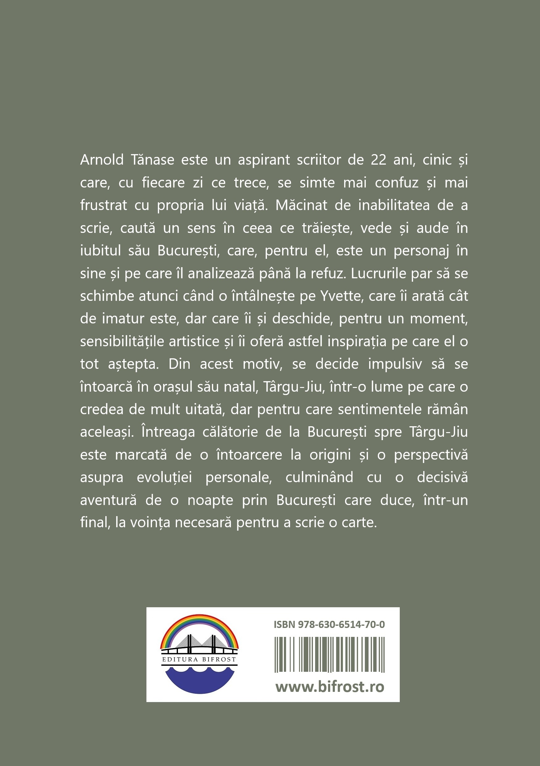 „Arnold Tănase este un aspirant scriitor de 22 ani, cinic și care, cu fiecare zi ce trece, se simte mai confuz și mai frustrat cu propria lui viață. Măcinat de inabilitatea de a scrie, caută un sens în ceea ce trăiește, vede și aude în iubitul său București, care, pentru el, este un personaj în sine și pe care îl analizează până la refuz. Lucrurile par să se schimbe atunci când o întâlnește pe Yvette, ... dar ... se decide impulsiv să se întoarcă în orașul său natal, Târgu-Jiu, într-o lume pe care o credea de mult uitată...” - AUTORUL